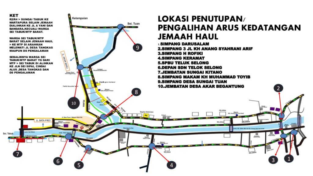 “Beberapa simpang yang akan dilakukan pengaturan di antaranya Simpang Darussalam, Simpang KH Anang Syahrani Arif, Simpang Haji Rofiqi, Simpang Keramat, SPBU Teluk Selong, depan SDN Teluk Selong, Jembatan Sungai Kitano, hingga Simpang Desa Sungai Tuan dan Jembatan Desa Akar Bagantung,” katanya.