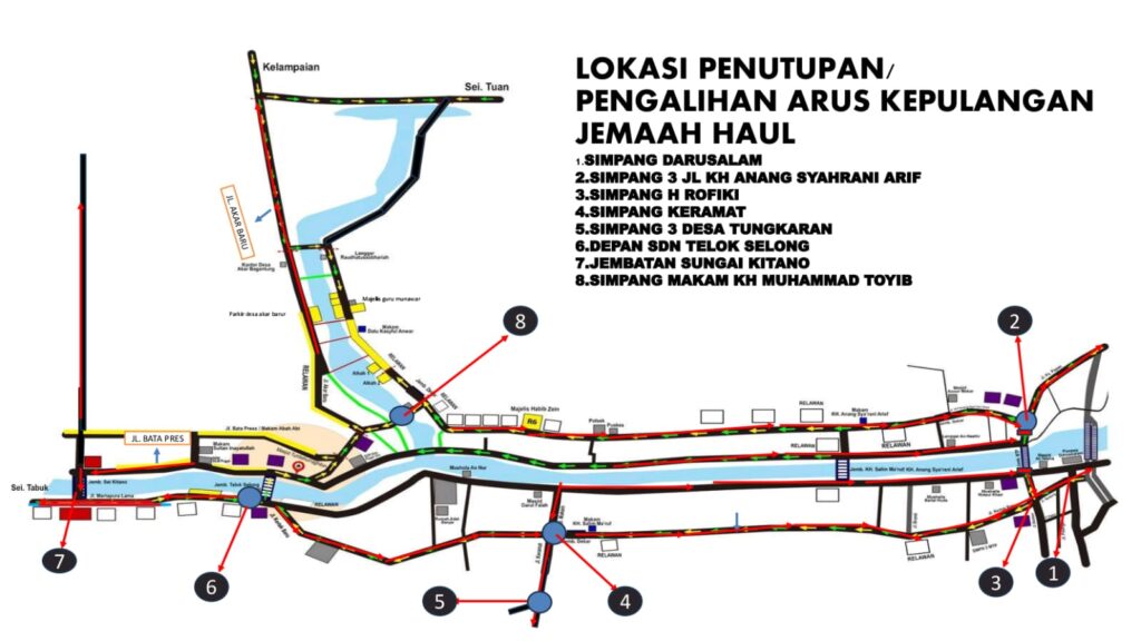 Rekayasa serupa juga diberlakukan saat arus kepulangan jemaah, terutama di titik-titik utama seperti Simpang Darussalam, Simpang KH Anang Syahrani Arif, Simpang Haji Rofiqi, Simpang Keramat, hingga Jembatan Sungai Kitano.