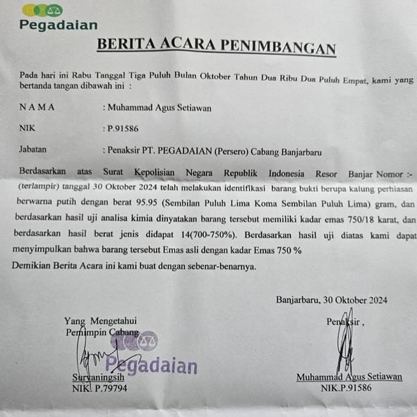 Bedasarkan hasil pembuktian surat dari PT Pegadaian Cabang Banjarbaru pada tanggal (30/10/2024), bahwa emas bewarna putih dengan berat 95,95 gram tersebut asli dengan kadar 750 persen.