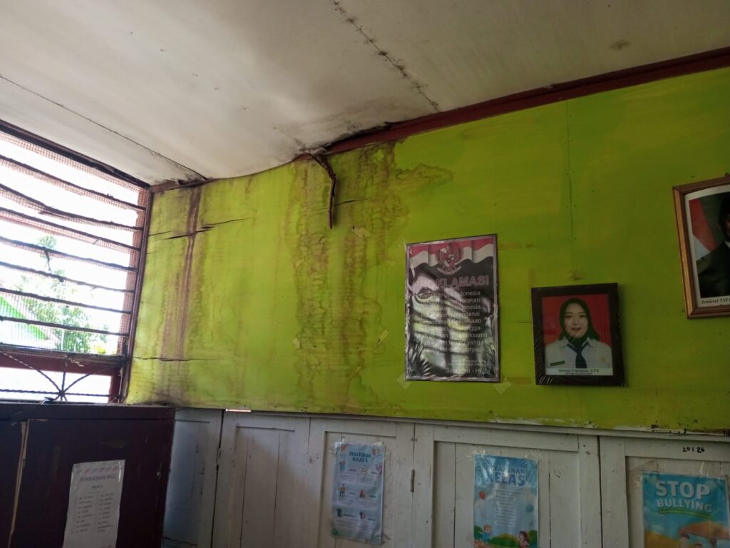 Di dalam ruang kelas, dinding terlihat retak di sejumlah bagian. Tak hanya itu, kondisi plafon pun jauh dari kata aman—tambal sulam di sana-sini menjadi bukti bahwa bangunan ini sudah lama “dipaksa bertahan” tanpa sentuhan perbaikan serius.
