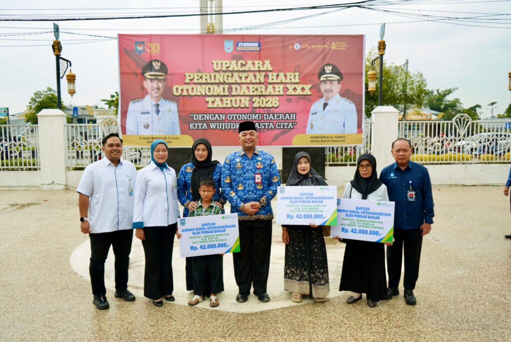 Usai upacara, kegiatan dilanjutkan dengan penyerahan santunan Jaminan Kematian (JKM) secara simbolis oleh Sekda Banjar bersama Kepala Kantor Cabang BPJS Ketenagakerjaan Banjarmasin kepada para penerima manfaat.