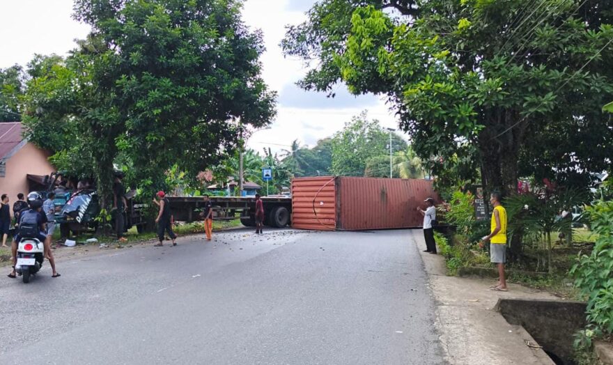 Damkarnews.com, Banjarbaru β Sebuah truk kontainer mengalami kecelakaan lalu lintas di ruas Jalan Pangeran Muhammad Noor, Kelurahan Sungai Besar, Kecamatan Banjarbaru Selatan, Kota Banjarbaru, Selasa (27/1/2026) siang. Insiden ini sempat mengakibatkan kemacetan panjang karena peti kemas yang dibawa truk terpental dan menutup sebagian badan jalan.